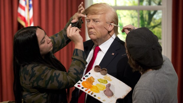 Londres, Angleterre, le 18 janvier 2017. Des employés posent avec le modèle en cire du nouveau président des États-Unis, Donald Trump, lors d’un shooting photo organisé pour promouvoir la nouvelle statue du musée de Madame Tussauds, dans le centre de Londres.