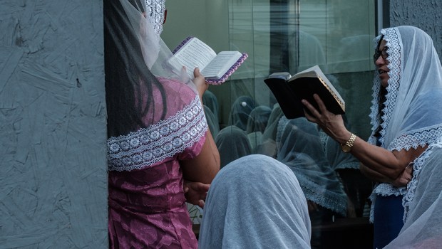 Des membres d’une congrégation chrétienne brésilienne chantent un hymne devant l’église pleine à craquer de l’une des communautés du Complexo do Alemao, un ensemble de favelas de Rio de Janeiro, le 25 mars 2017. © AFP PHOTO / Yasuyoshi Chiba