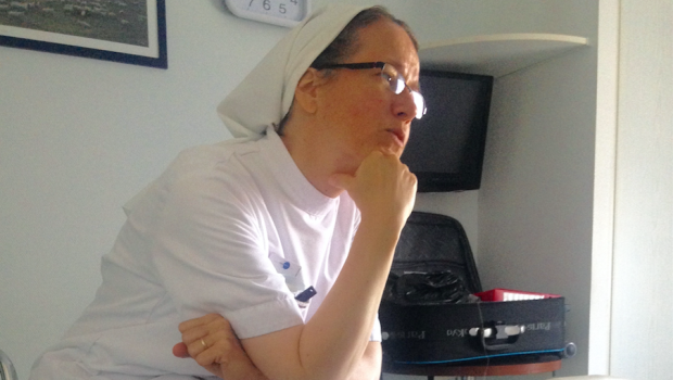 Infirmière de formation, sœur Roxane retrouve sous son voile et sa blouse blanche ses “deux poumons” : ses vocations, religieuse et soignante, sont complémentaires. Autour d’elle, une équipe pluridisciplinaire composée de plusieurs infirmières, d’un aide-soignant et d’un psychologue. Tous ont signé une charte d’adhésion aux valeurs éthiques de la communauté religieuse à qui appartient la clinique. “Nous ne mettons pas un terme et nous ne prolongeons pas la vie. Nous respectons la nature”, explique la religieuse. Tous ont cette « juste proximité » qui permet d’aimer le patient. On prend le temps d’écouter, de s’asseoir. « Nous ne considérons pas l’être humain comme un seul organe malade, mais dans toute sa personne. »