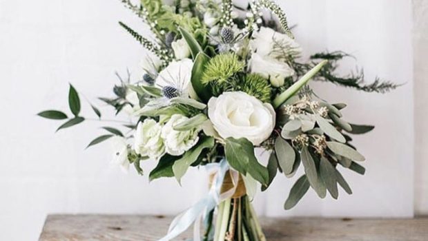 Coup de coeur pour ce superbe bouquet, avec son panel de fleurs blanches et quelques chardons, il se distingue également grâce à des branches d’olivier en pagaille. Avec quelques feuillages dans différentes tonalités de vert, il semble tout droit venu des champs. Le résultat offre à voir un bouquet désordonné, mais plein de charme.