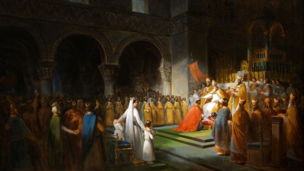Fils de Charles Martel et père de Charlemagne, Pépin le Bref sera le premier maire du palais à être proclamé roi, créant ainsi la dynastie des Carolingiens. Désirant assurer sa légitimité, il s’associe avec l’Église catholique et organise le premier sacre officiel de France. La tradition du sacre perdurera au cours des règnes suivants et sera célébré traditionnellement dans la cathédrale de Reims. Et pourtant, celui de Pépin le Bref s’est déroulé dans une autre ville, ancienne capitale des Mérovingiens. Roi des Francs de 751 à 768, Pépin le Bref, issu d’une famille noble appelée les “Pippinides”, n’était pas de sang royal. Et pourtant, il va réussir à monter sur le trône. À cette période, la dynastie mérovingienne est en pleine décadence et les rois légitimes n’ont plus aucune autorité. Les maires du palais — hauts dignitaires du royaume auxquels appartenaient les Pippinides — profitent de cette situation et deviennent très rapidement les vrais dirigeants de l’État. Une fois le pouvoir en poche, Pépin le Bref a l’intelligence de faire appel à l’Église catholique pour asseoir sa légitimité. Pour remplacer la succession naturelle père et fils et assurer quand même une continuité, il met en place le sacre royal, sorte de geste symbolique qui s’inscrit dans la continuité de l’onction rappelant le baptême de Clovis Ier, premier roi mérovingien.