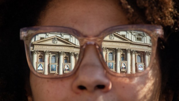 Des milliers de pèlerins se sont rassemblés dimanche, place Saint-Pierre, pour assister à la messe de canonisation de cinq bienheureux : le cardinal John Henry Newman (1801-1890), le plus célèbre des anglicans converti au catholicisme ; les trois religieuses Giuseppina Vannini (1859-1911), Mariam Thresia Chiramel Mankidiyan (1876-1926) et Dulce Lopes Pontes (1914-1992) ainsi que Marguerite Bays (1815-1879), une couturière appartenant au tiers-ordre franciscain. Parmi les fidèles, cette femme dans l’assistance, lunettes de soleil sur le nez. Pour le pape François, qui a célébré la messe, ces cinq personnalités témoignent d’une véritable “sainteté du quotidien”.