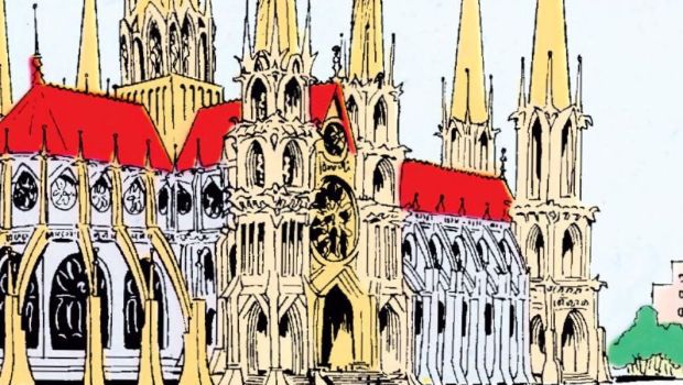Il s’agit de la cathédrale Notre-Duck, un célèbre monument de Donaldville, ville fictive des albums de Picsou. L’édifice, fictif, bien entendu, apparaît dans Le fantôme de Notre-Duck de Carl Barks, édité chez Glénat. D’aucuns croient en effet qu’un fantôme se cache dans la cathédrale. Sa verticalité, ses arcs-boutants, sa flèche et ses tours, témoignent de son style gothique médiéval.