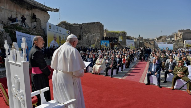 La diminution “tragique” des chrétiens représente un “dommage incalculable” pour la société irakienne, a affirmé le pape François, exhortant les Irakiens à la fraternité sur la place de l’église de Mossoul le 7 mars 2021.“Ici à Mossoul les tragiques conséquences de la guerre et des hostilités ne sont que trop évidentes”, a déclaré le Pape dans son bref discours avant de réciter une prière sur la place de l’église de Mossoul à 10 heures heure locale le 7 mars 2021. Arrivé par hélicoptère depuis Erbil, le pape François a pu constater l’état déplorable dans lequel se trouve la cité de Mossoul, ancienne capitale de l’État islamique. Si la périphérie semble bien conservée, le centre historique porte encore les stigmates des combats, particulièrement visibles sur la place de l’église où la foule est réunie. On estime à 12.000 le nombre de maisons détruites selon le représentant de l’Unesco en Irak, Paolo Fontani, interrogé par I.MEDIA. C’est là, au milieu d’un cloître en ruine, que le pape François s’est installé sous une croix faite du bois d’une église détruite. Si le décor est désolé, l’ambiance est à la fête : les Mossouliotes l’ont accueilli dans l’effervescence, sous des chants joyeux et des youyous.