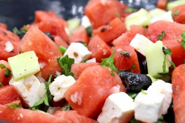 Ingrédients :Une petite pastèque sans pépins ou 1/4 d’une grosse pastèque bien fraîche - 200g de fêta - Une grosse poignée d'olives noires à la grecque de qualité - 3 ou 4 oignons nouveaux (vert + blanc) ou un oignon rouge - 1/2 concombre bien frais - Quelques feuilles de basilic frais ciselé ou menthe ou persil plat (facultatif) - 1 citron - Huile d'olive - Sel et poivre.