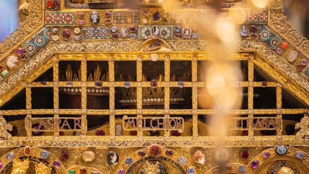 C’est à Milan dont il venait de s’emparer, qu’en 1162, l’empereur germanique Frédéric Barberousse découvrit le reliquaire, caché dans un monastère qu’il s’apprêtait à faire raser. À en croire la légende, la châsse, magnifique, irradiait une lumière surnaturelle. L’empereur, ayant appris que ces reliques étaient celles des rois mages, les offrit à l’archevêque de Cologne, Rainald von Dassel. Très vite, elles attirèrent de telles foules qu’il fallut lancer le chantier de la cathédrale colossale qui les abrite encore et ne fut achevée qu’en 1880. Racontée ainsi, en dépit de tout le charme qui l’entoure, l’histoire pourrait prêter à sourire et inspirer quelque méfiance, en dépit de l’immense vénération dont Melchior, Gaspard et Balthazar font l’objet.