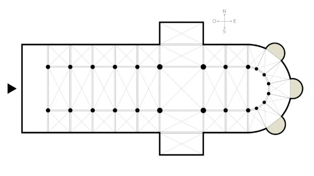 Sur le plan ci-dessus, trois absidioles, en gris, entourent le déambulatoire et épousent la forme de l'abside. À l'extérieur de l'église Saint-Nectaire, l'emplacement des chapelles absidiales est bien visible sur le chevet.