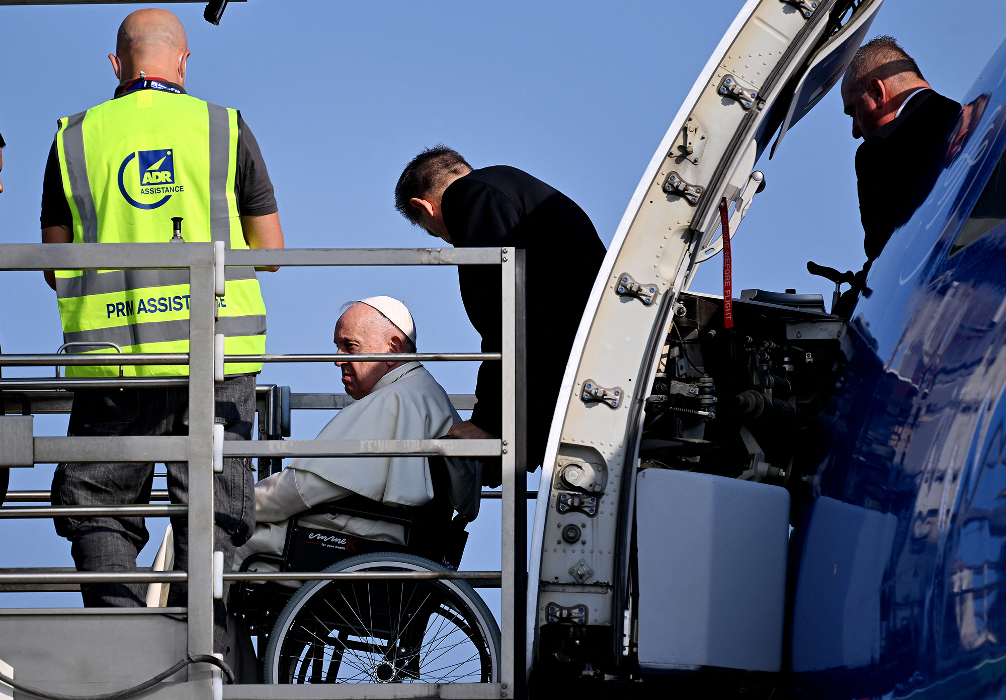Comme premier geste, le Pape a fait une halte auprès de la statue de sainte Anne présente à l’entrée, que les pèlerins ont pour coutume de toucher à leur arrivée. Puis, en dépit du programme prévu, le pontife de 85 ans n’est finalement pas monté à bord de la papamobile ouverte qui l’attendait. Offrant une image humble et dépouillée, il est resté sur son fauteuil roulant, guidé par son majordome.