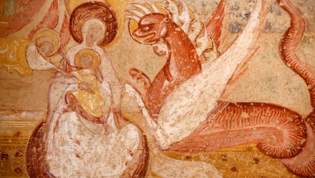 Plus loin dans le texte, alors qu’il est écrit que Marie crie dans les douleurs d’un enfantement, apparaît "un grand dragon, rouge feu, avec sept têtes et dix cornes, et, sur chacune des sept têtes, un diadème." Il s’agit là du symbole du mal qui veut entraver le plan de Dieu sur terre et apporte la mort et la destruction. Il essaie de dévorer le Fils mais "en vain" car Jésus, par sa mort et sa résurrection, est assis sur son trône. Il s’en prend alors à la femme, qui incarne l’Église. Mais l’Église étant soutenue par Dieu avec la Parole et l’Eucharistie, même si elle souffre de persécutions, elle en ressort victorieuse.