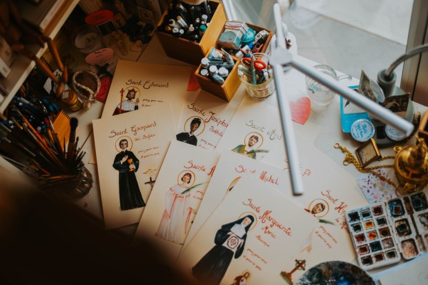 Mais c’est une vie très incarnée. Pour moi Jésus est partout, dans mon café, dans ce que j’ai à faire et c’est ça qui me sauve. Je suis sauvée par Lui quotidiennement. Tout le monde me demande : "Mais comment fais-tu ?" et en fait je parle à Jésus. Je fais des réunions célestes, c’est-à-dire que de temps en temps quand ça ne va plus du tout, je réunis tous mes amis du Ciel. Je parle à chacun en fonction de son talent, du saint patron. Je dis à Padre Pio : "Là, je suis désolée de te dire que ça ne va pas du tout ! Je trouve que tu n’es pas du tout à l’aise avec les anges gardiens de mes enfants. Il faut que tu carbures, ils sont insupportables, ils n’obéissent pas !". C’est vraiment un échange réel. Comme je dessine des saints patrons toute la journée, ce sont vraiment des amis. Je rentre en relation. Même dans la rue, je parle à Jésus. Les gens ne peuvent pas me prendre pour une folle, parce qu’’ils ont tous des oreillettes. Ils se disent "elle parle avec quelqu’un d’autre", mais en fait je parle à Jésus.