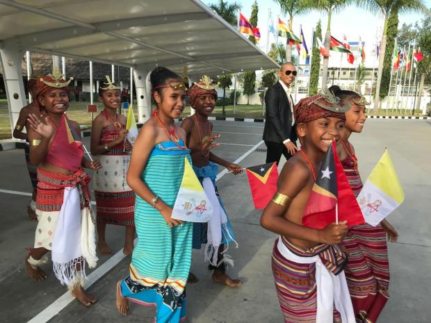 Quelques heures après son arrivée au Timor, le pape François a prononcé un discours aux autorités civiles au palais présidentiel, à Dili. Il a tenu à saluer le parcours de résilience de ce pays devenu indépendant en 2002 après une longue guerre contre l'Indonésie, louant "une aube de paix et de liberté". Juste avant de prononcer son discours, François était ovationné par les Timorais en habit traditionnel, portant fièrement un “surik” en bois, épée utilisée pour les danses locales (mais en bois pour respecter le protocole). Les officiels ont eux-mêmes difficilement caché leur émotion en voyant le Pape approcher du podium pour s'y installer. De son côté, le chef de l’État timorais a salué la première venue d’un pape depuis l’indépendance du pays, en soulignant que François "porte avec lui un message de paix, de réconciliation, de fraternité humaine et d’espérance, si nécessaire dans un monde de plus en plus défiguré où la froideur des cœurs a remplacé le dialogue et la paix".