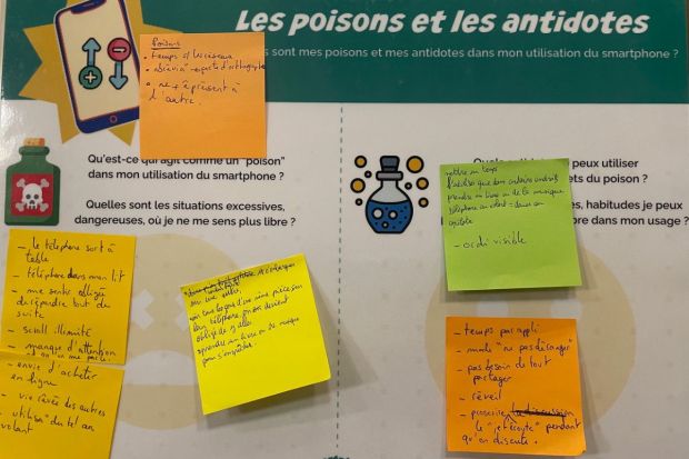 Jean Pouly fait ensuite remarquer que ces "super pouvoirs" ont des côtés bénéfiques (praticité, utilité, sécurité…) mais contiennent aussi des dangers et des limites. "Les participants vont ainsi explorer l’ambivalence des nouvelles technologies", souligne-t-il. Il s’agit ensuite d’identifier les poisons liés à l’usage de leur téléphone. "Quand je scrolle sur les réseaux, je n’arrive plus à m’arrêter et je sens que je perds mon temps" ou encore "je ne peux pas m’empêcher de regarder les likes". Un exercice qui pousse à s’écouter mutuellement et qui fait ressortir des éléments que les participants ne s’étaient généralement jamais confiés.