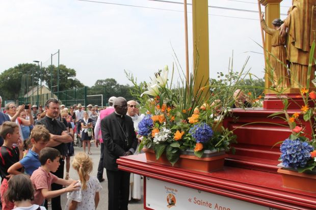 Alors qu’il s’apprête à présider les célébrations liturgiques du Grand Pardon de Sainte-Anne-d’Auray les 25 et 26 juillet prochains, le cardinal Robert Sarah, préfet émérite de la Congrégation du Culte Divin et de la Discipline des Sacrements, a rejoint la Troménie de Sainte-Anne à Mériadec le jeudi 24 juillet. Il a marché avec les pèlerins sur un kilomètre jusqu’à l’église de Mériadec, dernière étape avant l’arrivée au sanctuaire ce vendredi 25 juillet après-midi. L’occasion pour le cardinal guinéen de se recueillir devant la statue de la mère de la Vierge qui a parcouru pas moins de 1.800 kilomètres sur une calèche tirée par un cheval de trait durant quatre mois et demi.
