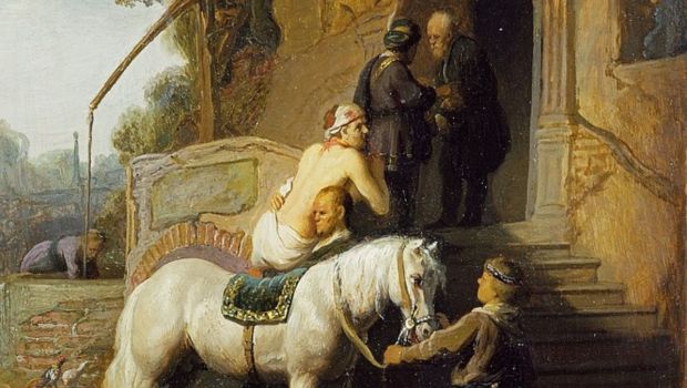 Si ce récit est connu, nous pouvons le redécouvrir par le regard des artistes qui l’ont à maintes reprises représenté, tel Rembrandt sur cette toile "Le Bon Samaritain" datant de 1632-1633. Sur celle-ci, le célèbre peintre de l’École hollandaise décrit en un luxe de détails qui le rendit célèbre la deuxième partie du récit évangélique. L’artiste évoque en effet cette fameuse parabole au moment où le Samaritain, après avoir chargé le blessé sur sa propre monture, parvient à une auberge où l’on pourra prendre soin de lui, à ses frais. Nous pouvons remarquer l’aisance apparente de ce saint homme – ce "bon samaritain", qui n’avait pas détourné son regard du voyageur laissé pour mort, à la différence des hommes de Loi qui, pour des raisons de purifications rituelles, s’étaient écartés de lui. Le bon Samaritain, souligne bien Rembrandt sur cette toile, a non seulement offert son aide, mais laisse également à l’aubergiste argent et consignes pour qu’il prenne soin de lui en un geste d’humanité sublimé par la palette du grand maître.