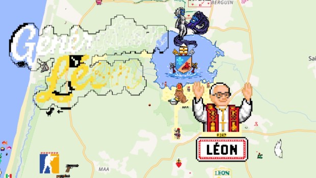 En zoomant sur la commune de Léon, dans les Landes, c'est justement le pape Léon XIV que l'on découvre pixellisé, avec la mention géante "Génération Léon". Un projet porté par Clémence Pasquier, jeune femme atteinte d'un cancer généralisé qui témoigne de son parcours et de son quotidien sur les réseaux sociaux, et plusieurs de ses amis, comme Thibaut Chourré, photographe documentariste catholique. Ces derniers appellent à les rejoindre pour poser des pixels et dessiner aussi bien des papes Léon que des petits gardes suisses ou encore l'emblème pontifical ! En d'autres endroits de la carte, on est surpris par l'apparition soudaine de multiples croix, entourées de la mention "Jesus is King" (Jésus est Roi) en Corse-Sud, près d'Ania, ou encore "Dio vi Salvi". A Rome, on tombe sur le blason du Vatican, l'inscription "Habemus Papam", "Christus Rex", ou encore le Gloria.