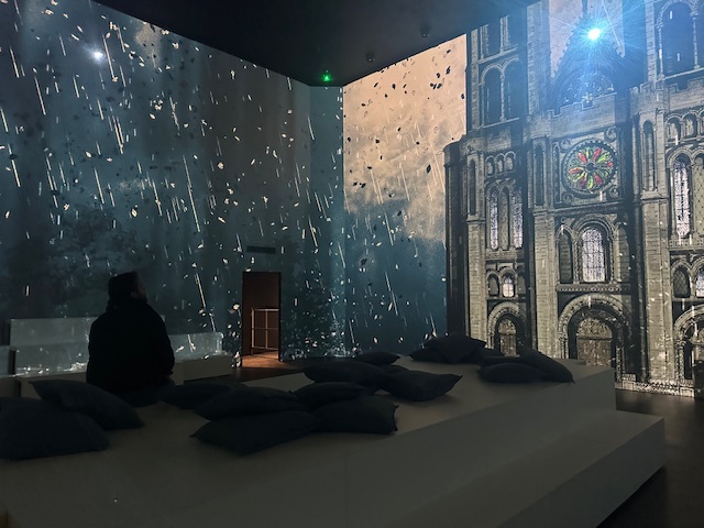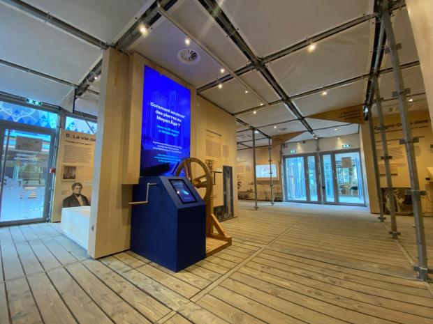 Au centre du parcours, un cube immersif à 360° invite à se plonger dans l’histoire de la basilique, des couloirs de l’ancienne abbaye royale aux chantiers des tailleurs de pierres actuels. Installé sur des coussins, le visiteur se laisse porter par les chants de moines et par la beauté des vitraux, projetés en gros plan. Cette installation, inspirée par l’esthétique de l’Atelier des Lumières, offre la possibilité d’apprécier les détails et la beauté insoupçonnée des œuvres, rarement accessibles d’aussi près. La réalité virtuelle s’invite elle aussi dans ce parcours. Équipé d’un casque VR (Virtual Reality), le visiteur s’installe confortablement sur un cube pour plonger dans un univers 3D évoquant un véritable atelier d’artisan. Il devient, tour à tour, maître d’œuvre sur un chantier virtuel de restauration de la flèche, puis se glisse dans la peau d’un tailleur de pierres. Grâce aux manettes, chacun peut manier la massette et la chasse en reproduisant les gestes des artisans d’autrefois. Une immersion numérique très ludique.