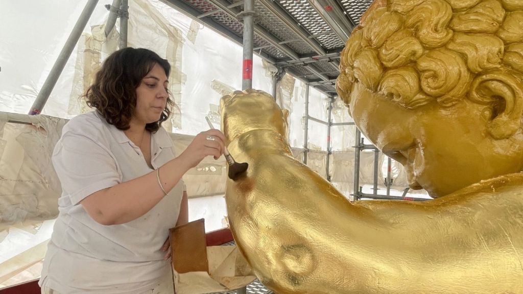Montage de 40 tonnes d’échafaudage, revêtement d’une bâche et équipement d’une climatisation pour assurer une température constante… Pour rendre à l’imposante sculpture son éclat d’antan – elle fait tout de même onze mètres de hauteur –, le chantier s’annonçait conséquent. Le sableur fut le premier artisan à s’y aventurer. Son rôle ? "Enlever les précédentes couches de dorure et de peinture jusqu’à arriver au cuivre d’origine", explique Cyrielle d’Antoni, responsable de ce chantier d’envergure. La doreuse des Ateliers Gohard connaît la chanson sur le bout des doigts. "Après le passage du sableur, les peintres ont déposé une peinture anti-corrosion pour limiter l’oxydation, puis deux couches de peinture classiques ont recouvert la sculpture".