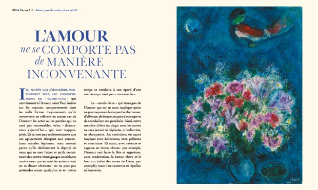 "L’idée de ce livre est de mettre en valeur l’hymne de saint Paul et de le rendre accessible à notre époque", explique Gabrielle Charaudeau, l’éditrice. "Il a une dimension spirituelle, avec les méditations, les poèmes de sainte Thérèse de Lisieux, mais aussi artistique : le lecteur s’imprègne des textes grâce aux œuvres." En effet, les Nymphéas de Monet ouvrent paisiblement les chapitres, les couples enlacés de Chagall illustrent magnifiquement l’intérieur, et les représentations médiévales de l’amour courtois invitent à la réflexion sur son propre couple. "Les œuvres choisies invitent à la contemplation, on retrouve les Nymphéas tout au long de l’ouvrage, ce sont des moments de respiration, et Chagall, c’est le peintre de l’amour !", s’exclame Isabelle Mascaras, l’iconographe.