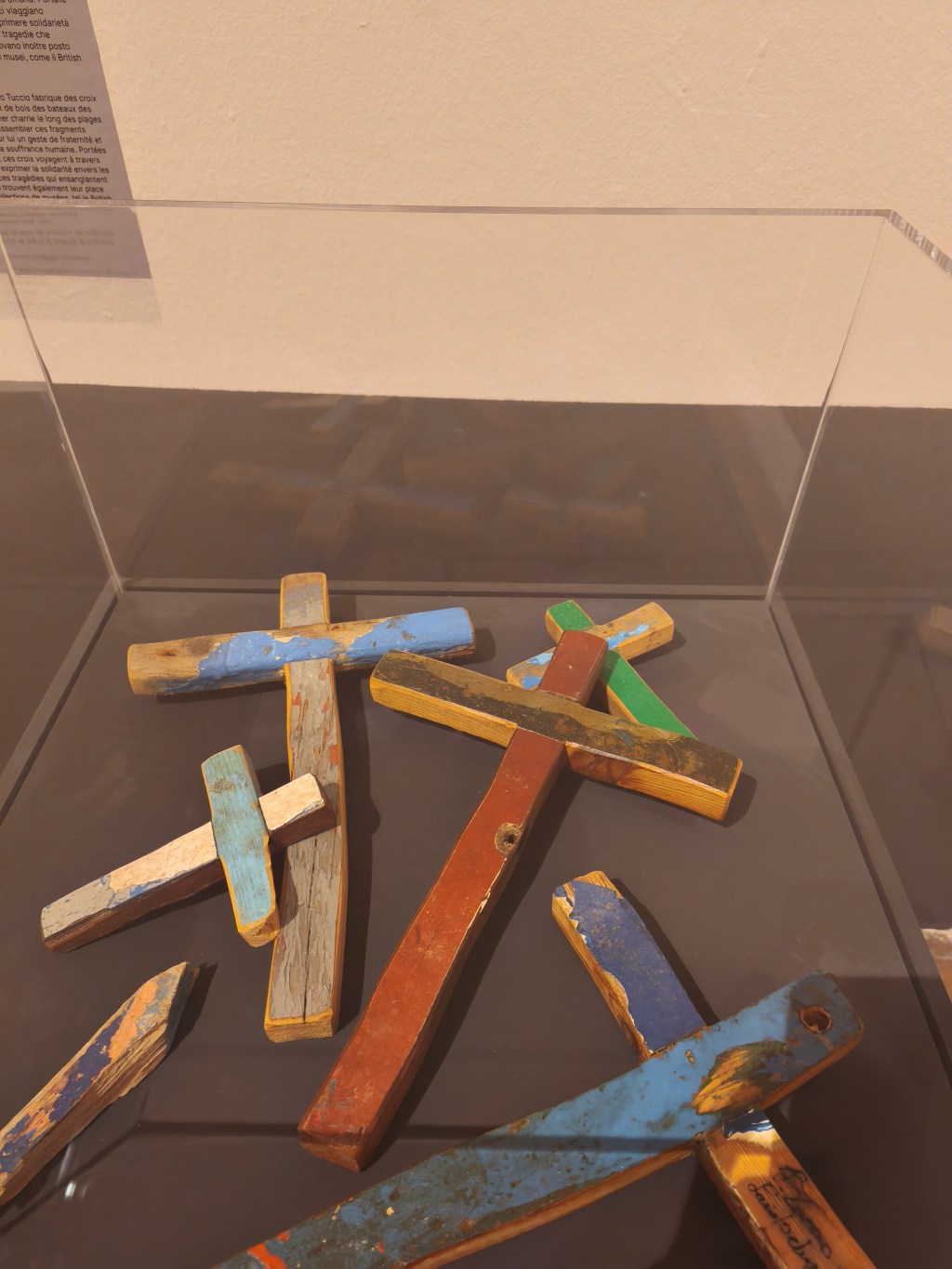 Alors que le pape François comparait cette mer à un cimetière, le visiteur ne peut pas rester insensible devant les croix fabriquées par l’ébéniste Francesco Tuccio avec le bois des bateaux des migrants échoués à Lampedusa. Des peintures conservées au Mucem faisant mémoire des marins morts en mer qui se confiaient à Notre-Dame de la Garde font également une grande part de cette salle consacrée à la Méditerranée.