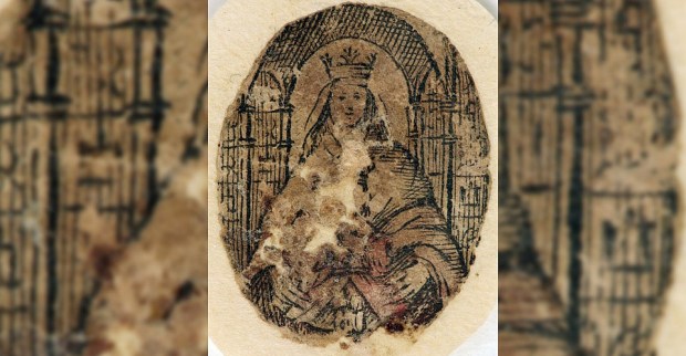 Mais le chef, regrettant la solitude des forêts, refuse le baptême. La Vierge Marie lui apparaît alors une seconde fois. Furieux, il veut la tuer avec son arc. Mais l’apparition disparaît, lui laissant dans la main un petit parchemin : son image. Elle est représentée assise, portant l’Enfant Jésus sur ses genoux. Jésus tient le globe terrestre de la main gauche et bénit de la main droite.